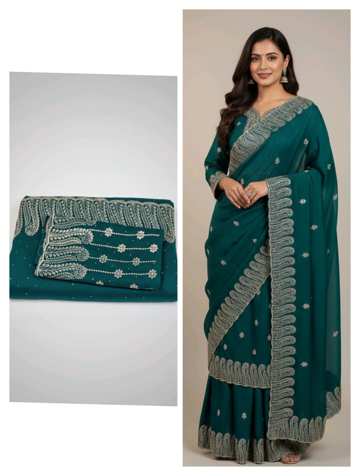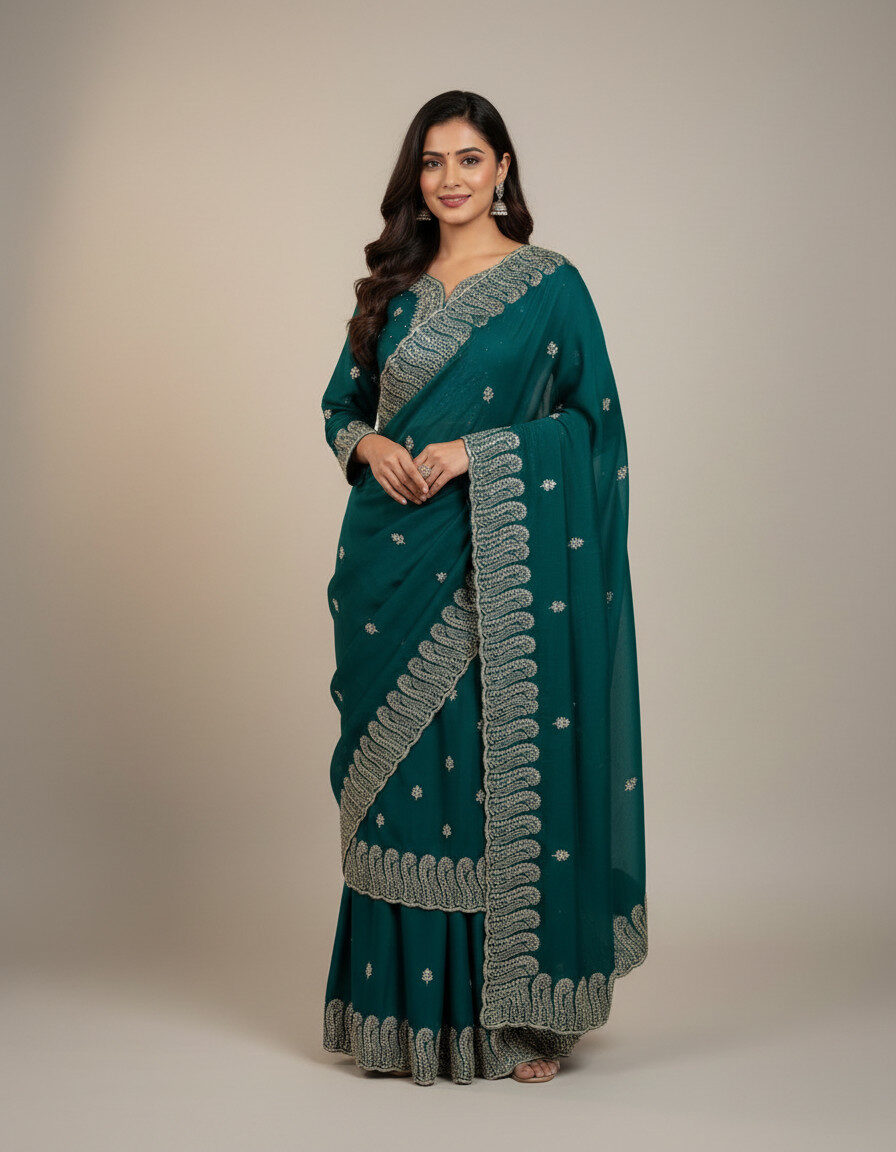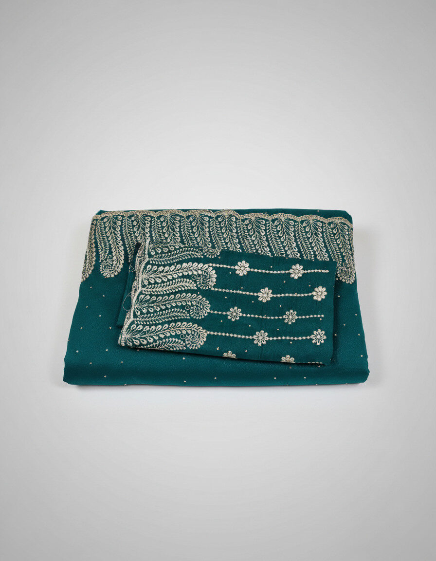 A majestic teal drape crafted with intricate designer embroidery, offering a luxurious shine and graceful fall — perfect for weddings, festive events, and grand celebrations.